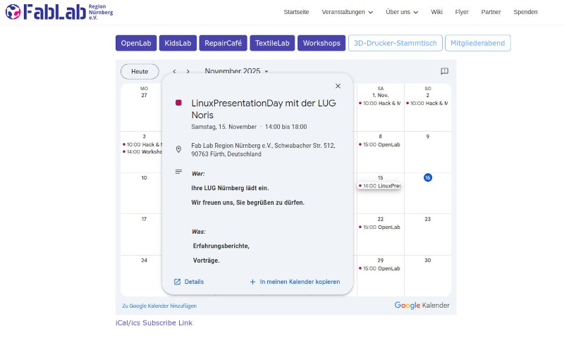 Hier ein Screenshot der Home-Seite des FabLabs Region Nürnberg mit einem netten Hinweis auf unsere Veranstaltung: